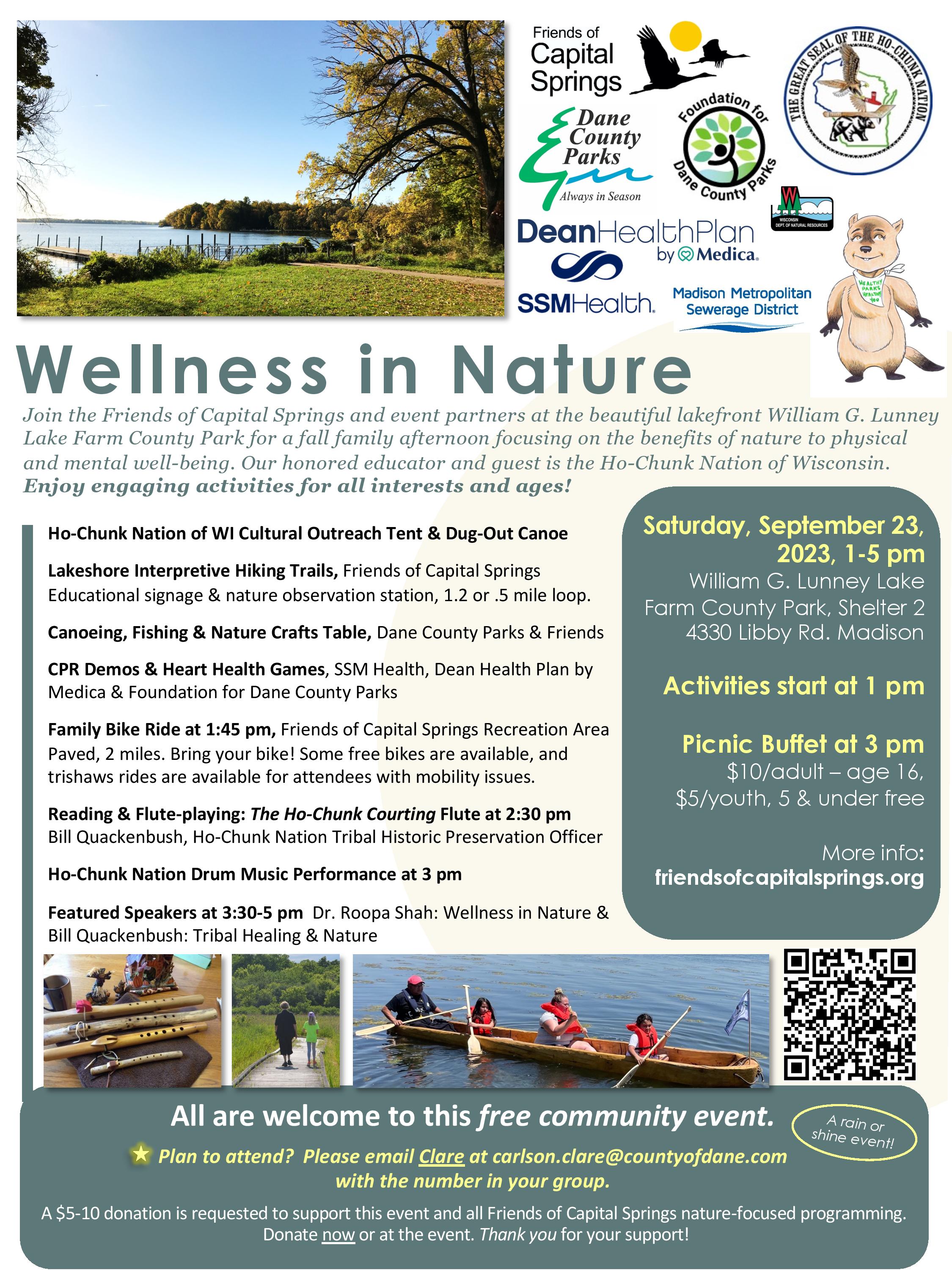 Join the Friends of Capital Springs and event partners at the beautiful lakefront William G. Lunney Lake Farm County Park for a fall family afternoon focusing on the benefits of nature to physical and mental well-being. Our honored educator and guest is the Ho-Chunk Nation of Wisconsin. Enjoy engaging activities for all interests and ages!